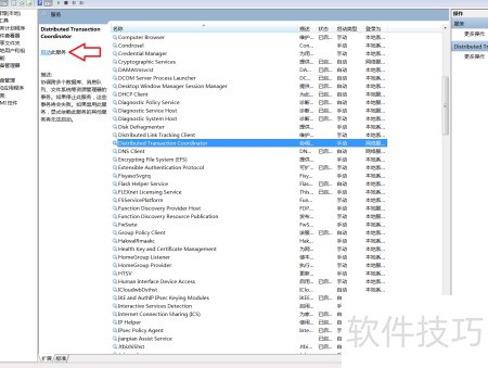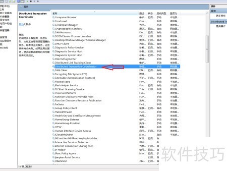 4、 在右侧列表中定位到分布式事务协调器(即MSDTC),具体位置所示。