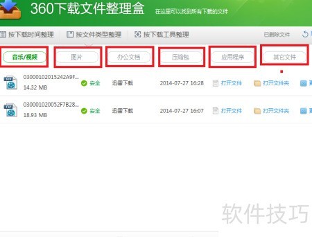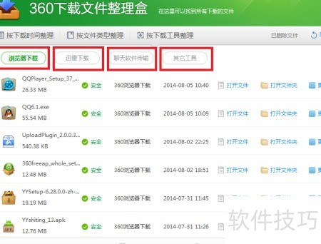 4、 按下载工具分类,可分为浏览器下载、迅雷下载、聊天软件传输及其他工具。该方式适用于清理各类大小文件,尤其适合处理大文件。通常使用迅雷下载的多为游戏、电影等大体积文件,因此通过下载工具分类清理大文件更为便捷高效。
