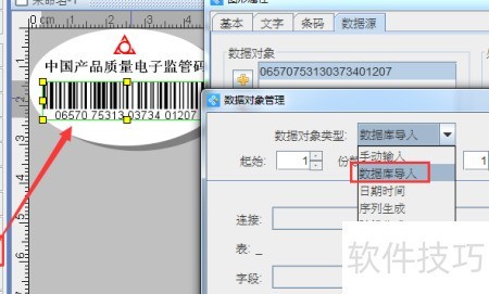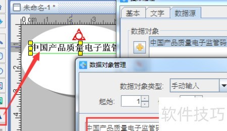 4、 在椭圆形电子监管码标签上添加电子监管码后,可通过属性中的数据源修改内容。该标签软件支持通过数据库导入实现批量生成电子监管码,具体操作可参照相关数据库导入教程进行学习与应用。