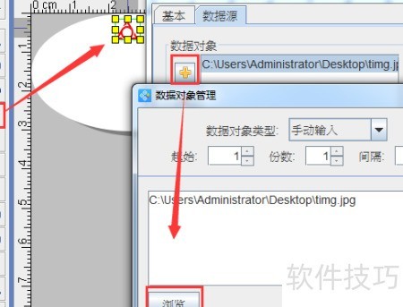 2、 在标签软件中使用插入位图功能添加电子监管码图片,打开属性设置,在数据源处输入图片路径,既可直接复制路径粘贴到输入框,也可通过浏览按钮选择目标图片完成添加操作。