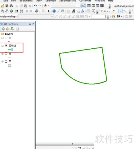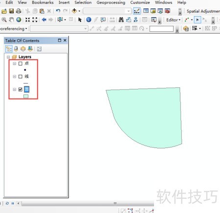 1、 启动ArcMap,加载点、线、面图层,在面图层中绘制一个区域,所示。