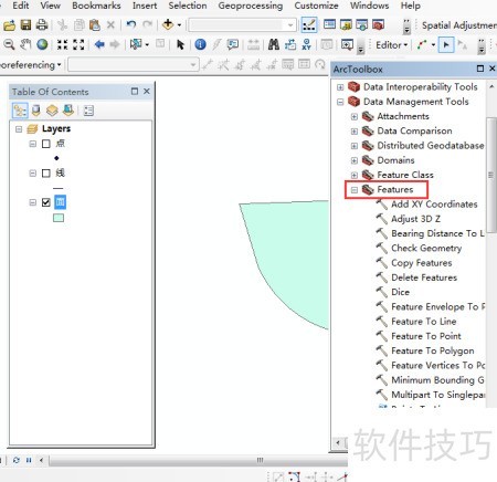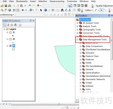 4、 在ArcToolBox中依次展开数据管理工具,即可找到Data Management Tools相关功能选项。