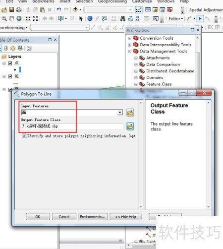 6、 点击面转线工具,弹出对话框后选择待转换的面图层,并指定输出文件的名称及保存路径,完成设置后执行转换操作。