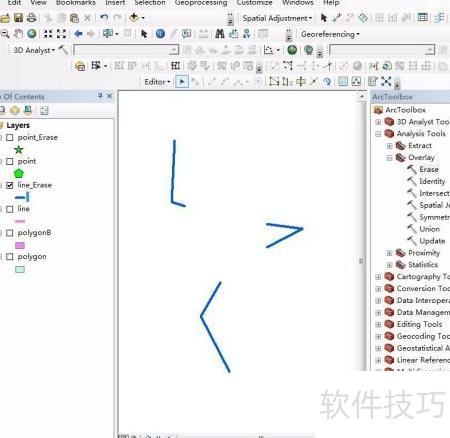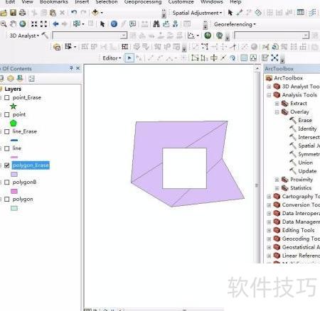 6、 同样可采用此方法处理线图层和面图层,下图即为对线要素与面要素进行擦除操作后的效果展示。