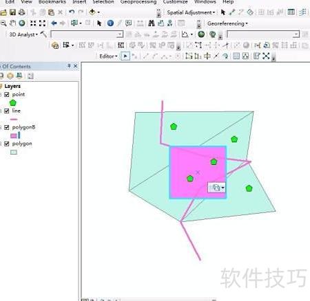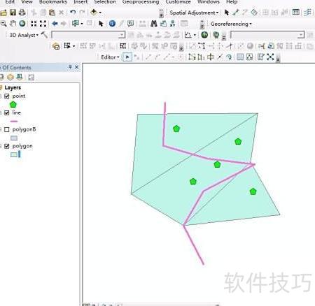 1、 在ArcMap中加载了点、线、面和面B四个图层,其中点、线和面图层均已绘制相应图形,具体显示效果如附图所示。