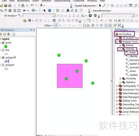 3、 启动ArcToolbox,进入工具箱界面,查找并定位其中的擦除(Erase)功能工具。