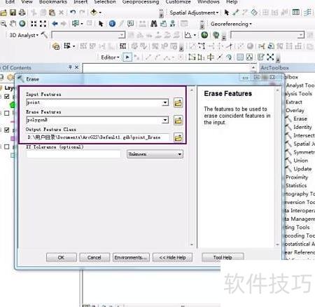4、 双击erase打开相应对话框,设置输入图层、擦除图层、输出图层及容差参数,此处首先选择点图层作为操作对象。