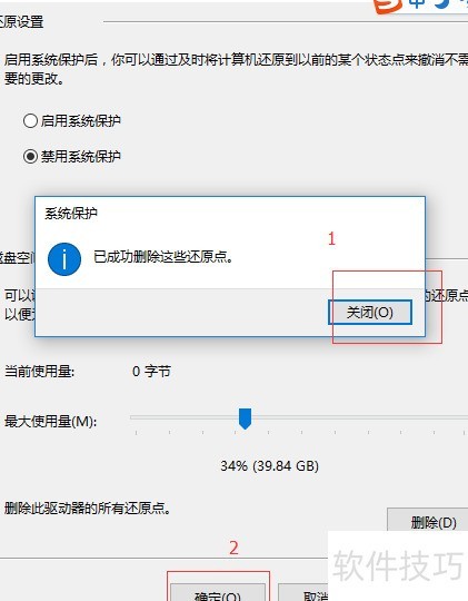 4、 在电脑界面按下 Win+X,打开菜单后选择系统,进入后点击系统保护,将保护状态设为禁用。随后选择对应盘符,删除原有还原点,弹窗提示时点击继续,最后点击关闭并确认操作完成。