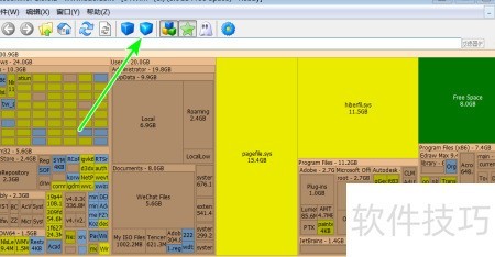 3、 点击工具栏中三个立方体图标,以黄色突出显示当前文件所占存储空间。