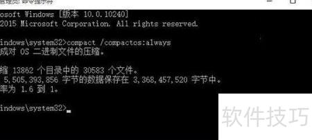 6、 Compact功能对系统性能影响较小,但可能造成磁盘碎片难以整理,因此不推荐在机械硬盘上启用。如需使用,可通过管理员权限运行命令提示符,输入compact /compactos:always后按回车执行即可完成设置。