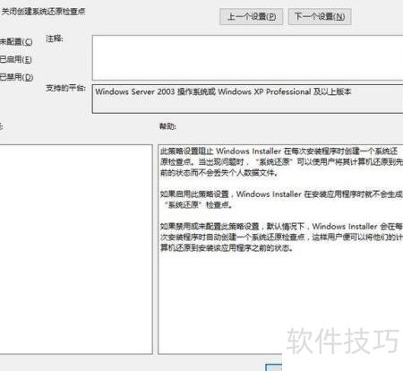 4、 在组策略中依次展开计算机配置、管理模板、Windows组件和Windows Installer,找到关闭创建系统还原检查点选项,将其设置为启用,以完成禁用系统还原的操作。随后,需进一步处理隐藏的System Volume Information文件夹,清理或限制其占用空间,从而优化系统性能并释放磁盘容量。
