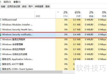 6、 向下滚动页面,点击Windows Defender图标所在行,随后选择结束任务。执行该操作后,系统中的Windows Defender图标便已成功隐藏。