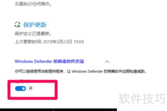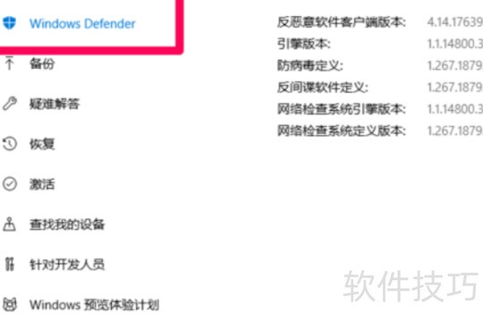 5、 四、进入更新与安全选项,选择其中的Windows Defender并点击开启。
