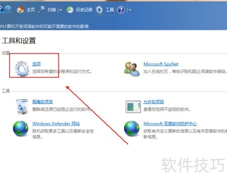 5、 在 Windows Defender 界面顶部选择工具功能选项。