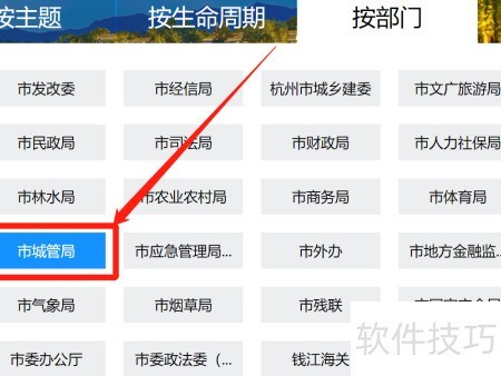 1、 登录当地政务服务网站,从部门列表中选取市城管局即可。