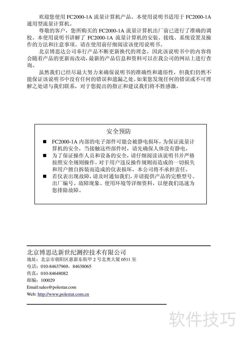 、 本书为博思达FC2000-1A流量计算机使用指南,详细说明产品操作步骤及常见问题处理方法,帮助用户正确高效使用设备。