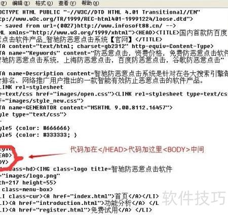 6、 登录软件后,界面中央显示的乱码实为监控代码。推广商品时,需将此代码嵌入每个网页源码中,置于与标签之间,确保每页均添加完整,以增强拦截效果,提升整体推广效率。