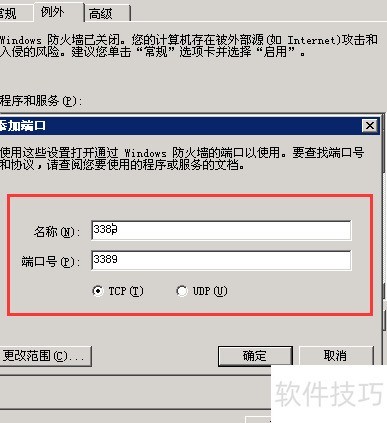 4、 进入选项卡,点击,在弹出窗口的与栏均输入3389,随后点击。若使用非默认端口,请根据实际填写对应号码。完成上述操作后,远程服务器的远程桌面功能即已成功启用,允许外部通过指定端口进行连接访问。