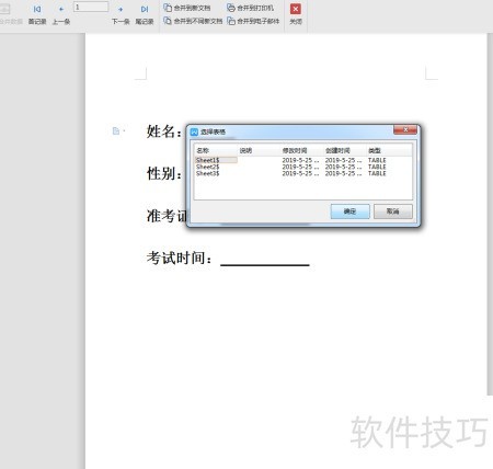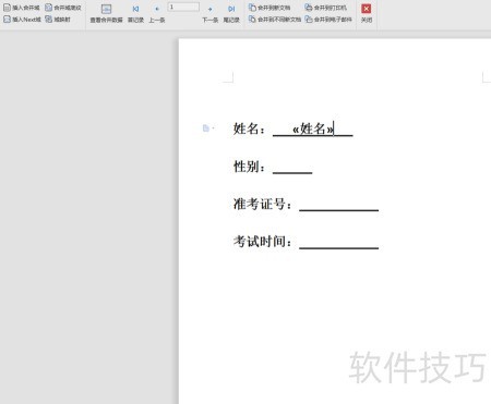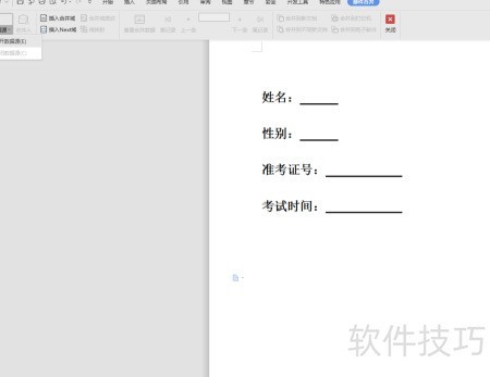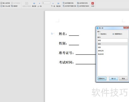 7、 选中需填写性别的位置,点击左上角插入合并域,在弹出的对话框中选择性别项并插入,随后依次完成姓名、准考证号及考试时间等区域的编辑操作,确保各字段准确无误。