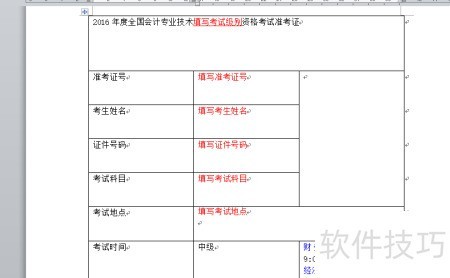 4、 准考证模板确定后,即可填写相关内容。首先在第一行写明考试名称,如某某考试准考证,随后依次填写考生姓名、考试时间、考试地点等关键信息。具体填写要求通常较为明确,若存在疑问,在制作过程中会提供纸质样张作为参考,便于对照填写,确保信息准确无误。