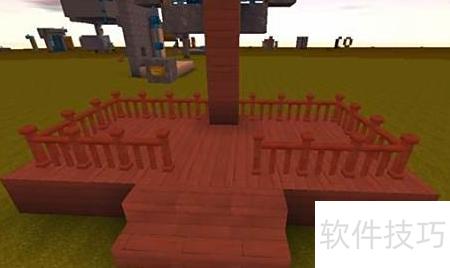 14、 电梯的电路控制系统已安装完毕,接下来需搭建承载平台。在地面标记点(+)周围,使用红杉木板(非自然生成方块)构筑平台,具体结构根据实际情况调整,也可加装围栏进行装饰与安全防护。