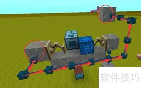 12、 在另一侧推拉臂后方放置一块岩石,电梯后方按图示连接导电线并延伸一格,接着连接另一块岩石,其正面安装触碰按钮,作为二楼电梯的下降控制开关。