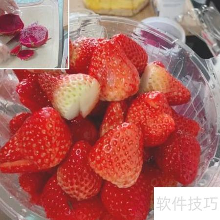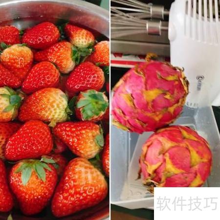 1、 准备好火龙果和草莓,我做的分量较大,因此准备得也比较充足。