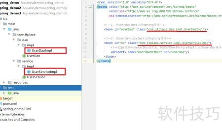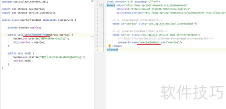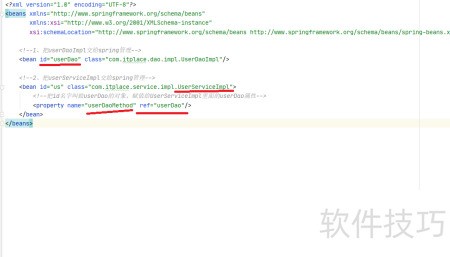 2、 id用于唯一标识,ref则将userDao对象注入到UserServiceImpl类的对应set方法中。