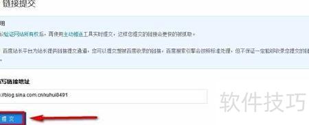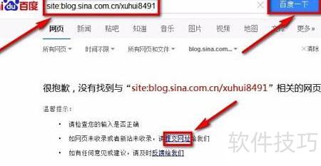 4、 在百度搜索栏输入site:blog.sina.com.cn/xuhui8491,点击百度一下,若结果显示未收录,则表明该博客页面尚未被百度收录。随后点击提交网址按钮,系统将跳转至链接提交页面,用户可在此提交网页链接,以便搜索引擎更快抓取和收录相关内容。
