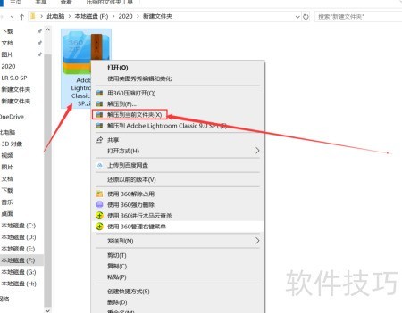 2、 右键点击Adobe Lightroom Classic 9.0 SP,选择解压到当前文件夹即可完成解压操作。