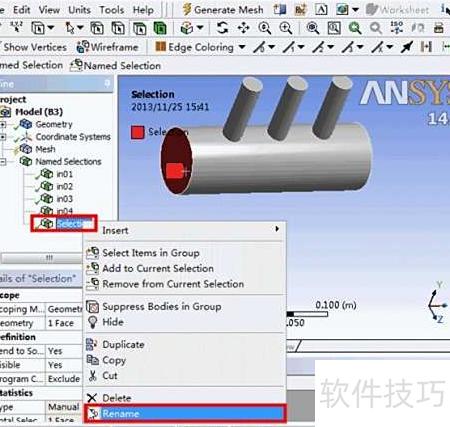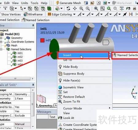 1、 承接前文管道分析ICEM-CFD网格划分(2/3),接下来进行出口设置,选取图示表面,右键点击后选择Insert中的Named Selection,操作方式所示。