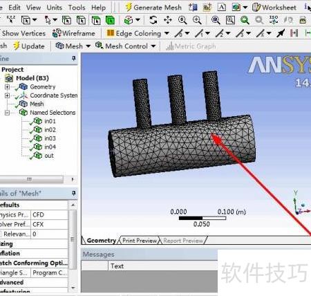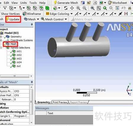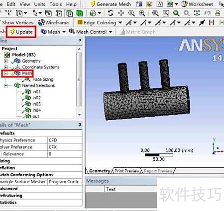 4、 选择Mesh选项进入网格划分模式,点击上方Update按钮进行更新,操作所示。