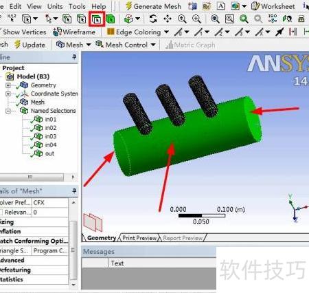 6、 绘制网格后发现大圆柱部分网格过疏,现需进行细化。使用选择面工具,按住Ctrl键,选取图示的三个面,具体操作所示。