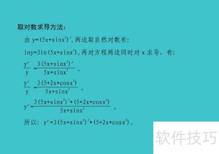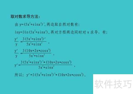 8、 对函数两边取自然对数,化简后利用对数求导法,分别对内外层函数求导,结合链式法则与导数运算法则,整理得到原函数的导数表达式。