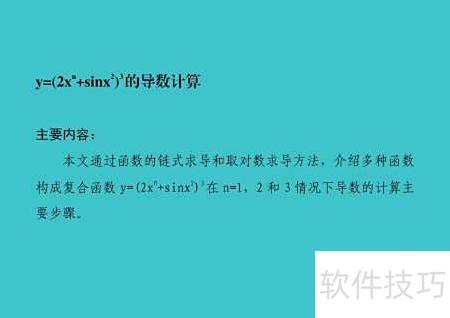 1、 本文运用链式法则、对数求导法以及幂函数和三角函数的求导公式,重点阐述当n取1、2、3时,复合函数y=(2x^n+sinx^2)^3求导过程的主要步骤。