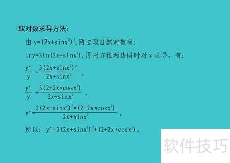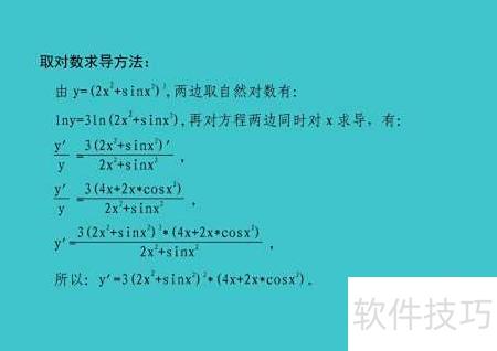 3、 利用对数求导法,结合幂函数与三角函数的导数公式,求函数 y = (2x + sinx?) 的导数。