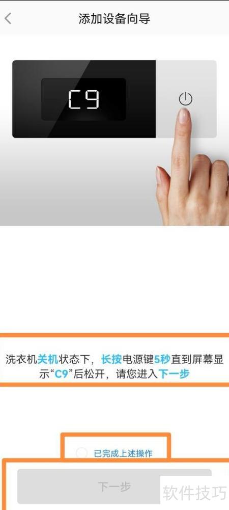 5、 通电启动洗衣机,长按5秒至屏幕显示C9,确认后勾选完成,进入下一步操作。