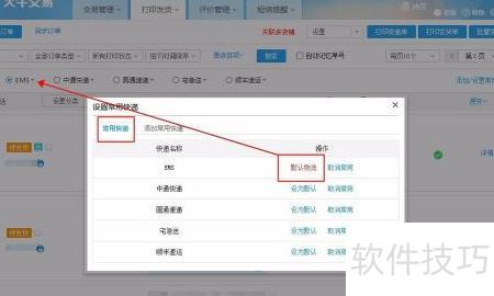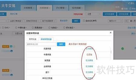 3、 选择所需物流公司,点击设为常用,或在搜索框中输入名称查找。设置完成后可在常用快递中查看,并支持设定默认物流选项。