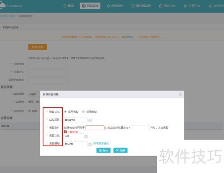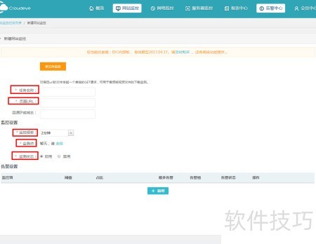 4、 填写任务名、网址、源站地址或IP、检测间隔,选定监测位置,开启监控功能。