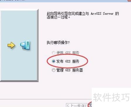 4、 在弹出的添加ArcGIS Server窗口中,选择发布GIS服务选项,点击下一步按钮,操作界面所示。
