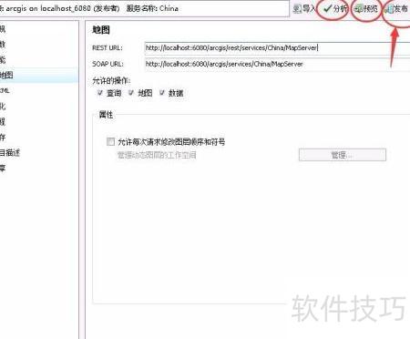 8、 在服务编辑器对话框中,依次点击右上角的分析、预览与发布按钮,操作所示。
