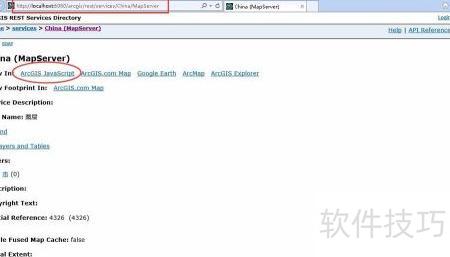 11、 在浏览器中输入地图服务的REST地址后,点击ArcGIS JavaScript选项,操作界面所示。