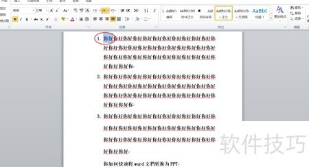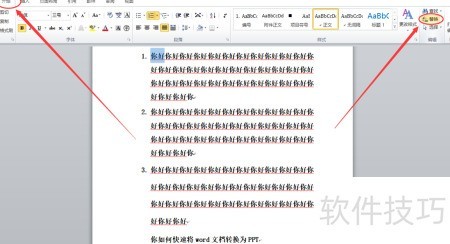 1、 打开Word文档,选中要替换的文字,以将所有你好替换为您好为例进行操作。