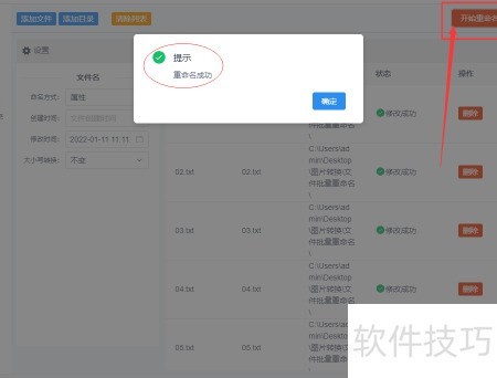 3、 第三步,完成设置后点击开始重命名按钮运行程序。等待片刻,当弹出重命名成功提示时,表示文件的修改时间已全部更新完毕。