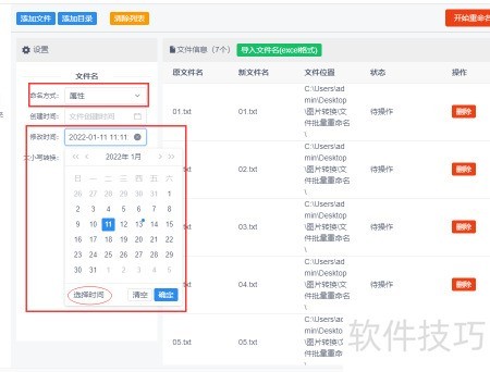 2、 第二步,进入设置界面,选择属性命名方式,设定新的修改时间,并精确至秒(如示例:2022年1月11日 11:11:11),若需调整创建时间,也可在此一并设置。