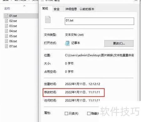 4、 步骤4,查看文件时间属性,确认修改时间已更新为2022年1月11日11时11分11秒,表明操作成功。