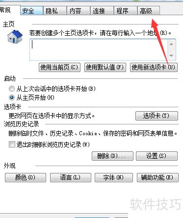 2、 打开Internet选项,点击右上角的高级设置按钮进入相关配置界面。