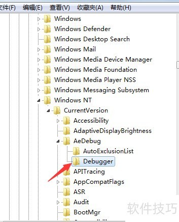 6、 进入注册表编辑器,找到路径 HKEY_LOCAL_MACHINESOFTWAREMicrosoftWindows NTCurrentVersionAeDebug,然后定位到其中的 Debugger 项,对其进行查看或修改操作,以调整系统调试相关设置。