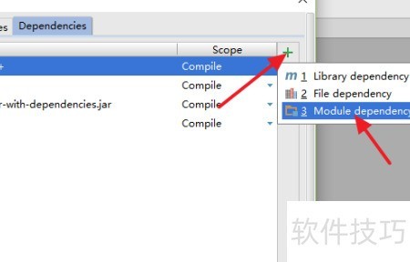 7、 点击右侧+号,从下拉菜单中选择模块依赖,随后弹出项目选择窗口供您进行配置。