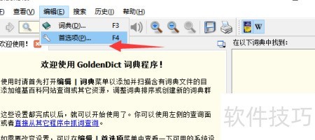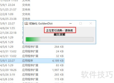 6、 运行 GoldenDict.exe 文件,本例中该文件位于目录下。为便于日后快速启动,可右键创建桌面快捷方式或将程序固定至任务栏。初次启动时,界面会显示正在索引词典,请稍候的提示信息。若已加载的词典数量较多,系统需要较长时间完成索引构建,此时请耐心等待,直至处理完毕即可正常使用各项查词功能。